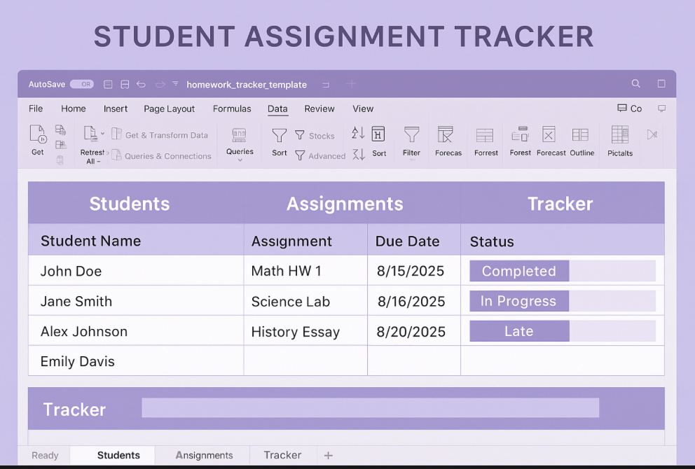 Bring organization and calm to your classroom with this beautifully designed lavender-themed Excel tracker. Perfect for teachers, this tool makes it easy to manage student names, assignments, due dates, and progress — all in one place.