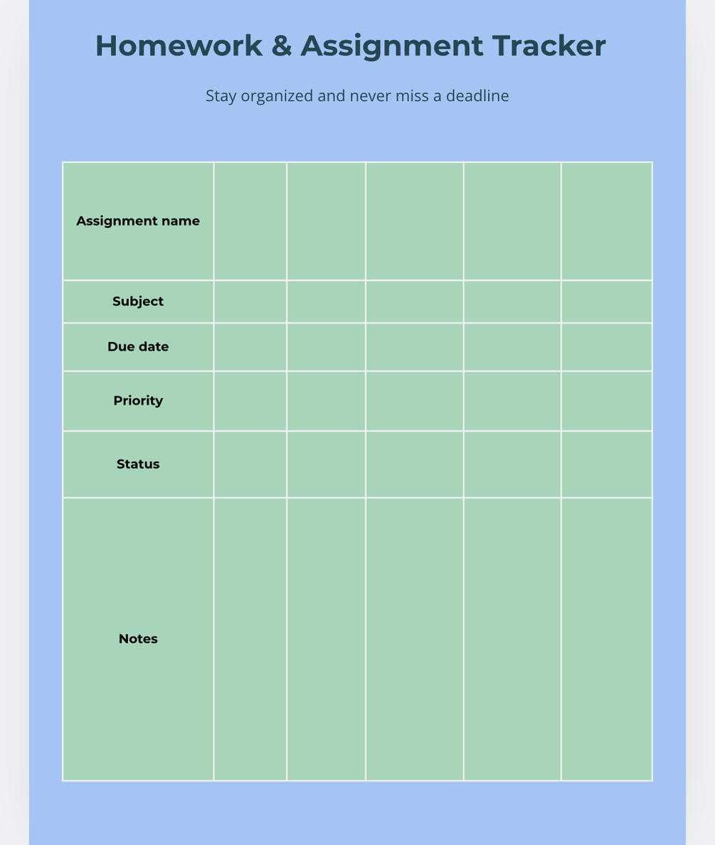 Stay on top of your schoolwork and never miss a deadline with this easy-to-use homework tracker! Designed for students who want to stay organized and boost productivity, this printable tracker helps you: